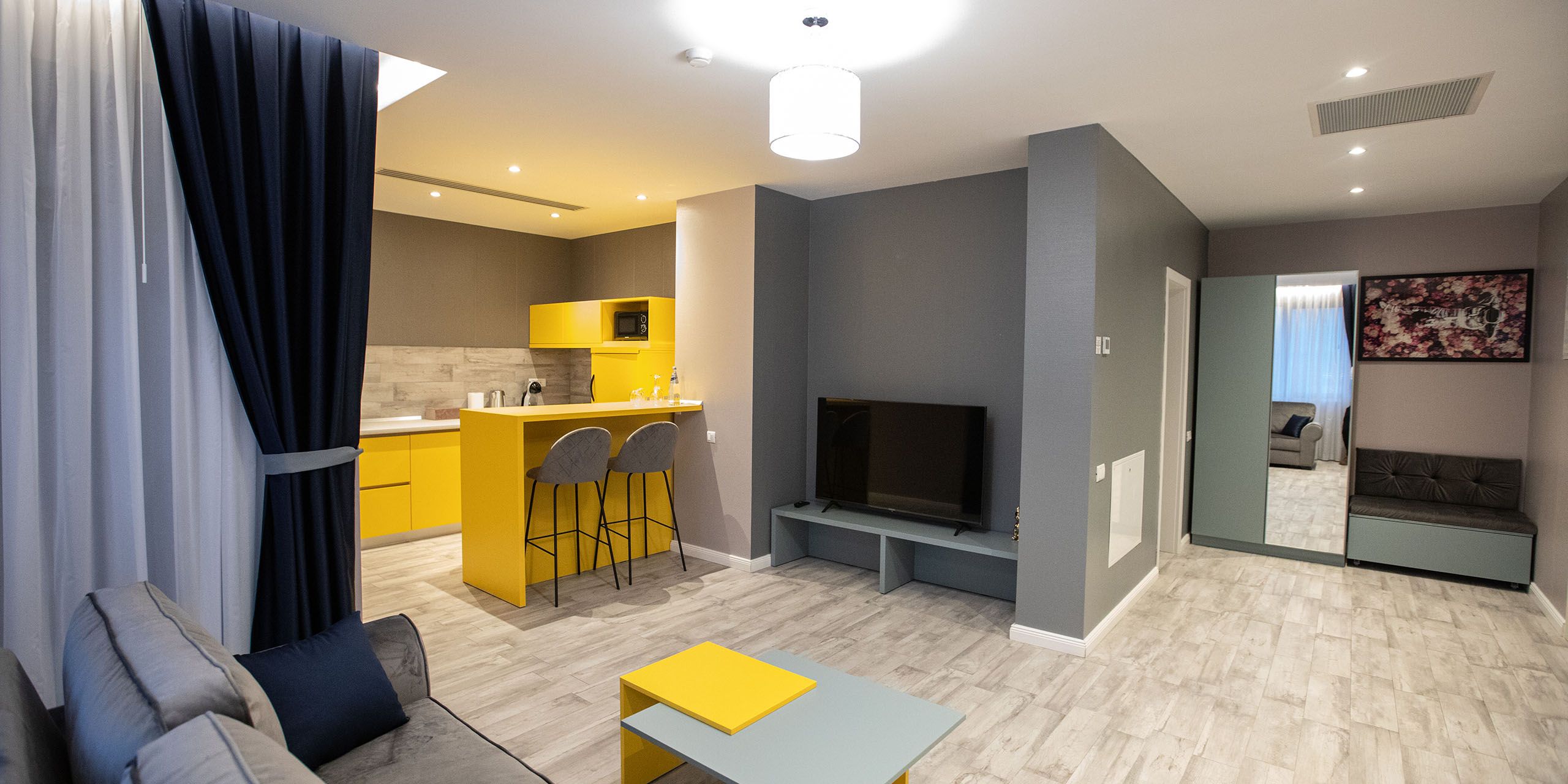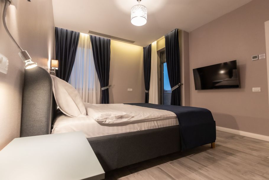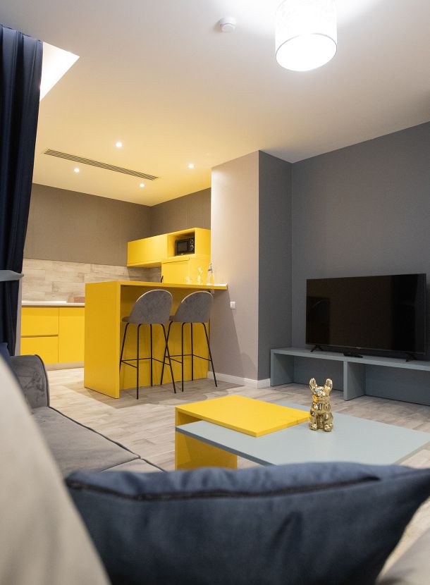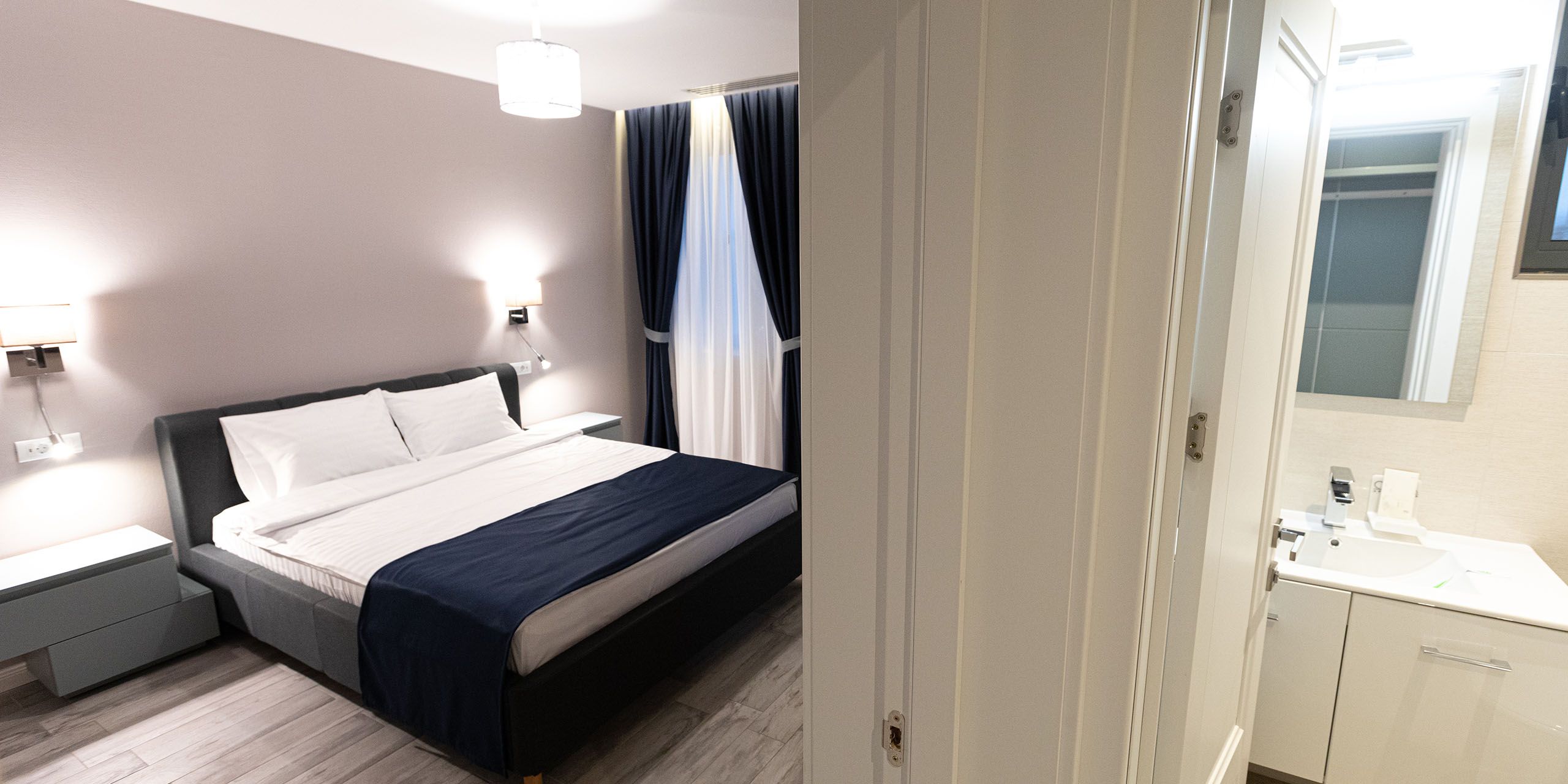 Apartamentul are un dormitor prevazut cu pat kingsize, are doua bai moderne si o zona de living spatioasa. Livingul este mobilat modern, include TV si wi-fi si canapea extensibila pentru a gazdui pana la 4 persoane. In bucataria sa open-space va puteti bucura de gatit dar si de compania oaspetilor. Va puteti bucura de aerul proaspat sezand pe balconul mic si intim al dormitorului sau pe balconul comun la care aveti acces din living.