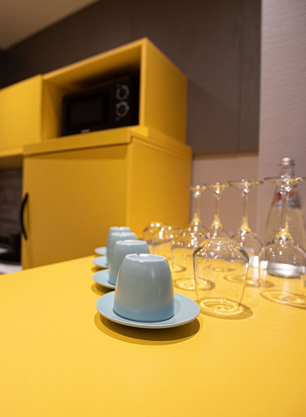 Un spatiu ideal pentru luarea meselor impreuna, dar si prepararea acestora in compania invitatilor.